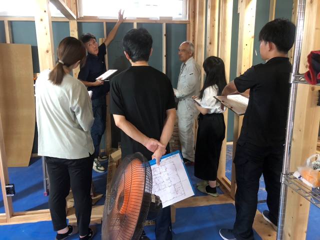 先日、吹付け断熱の施工前に、お施主様・現場監督・電気工事士と一緒に、電気配線まわりの最終確認を行いました。