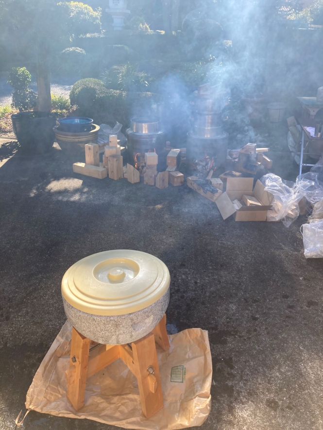 最近では珍しくなった、釜戸(かまど)に薪を焚べ、石臼と杵(きね)を使った本格的な餅つきです。