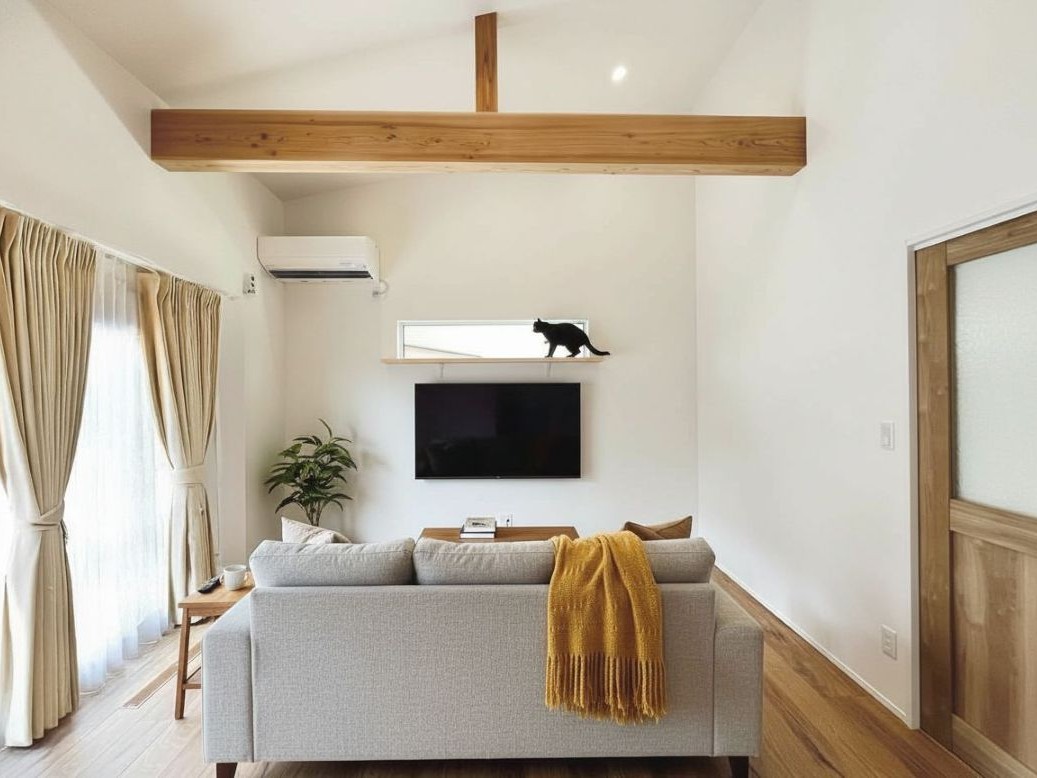 テレビ上にフィックス窓とキャットウォークを設け、猫ちゃんが外を見ながらくつろげるスペースに。
